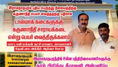 இராமநாதபுரம் புதிய பேருந்து நிலையத்திற்கு கருணாநிதி பெயரை வைத்ததற்கு பதிலாக டாஸ்மாக் கடைகளுக்கு கருணாநிதி சாராயக்கடை என்று வைத்திருக்கலாம் என்று பாட்டாளி மக்கள் கட்சியின் இராமநாதபுரம் கிழக்கு…