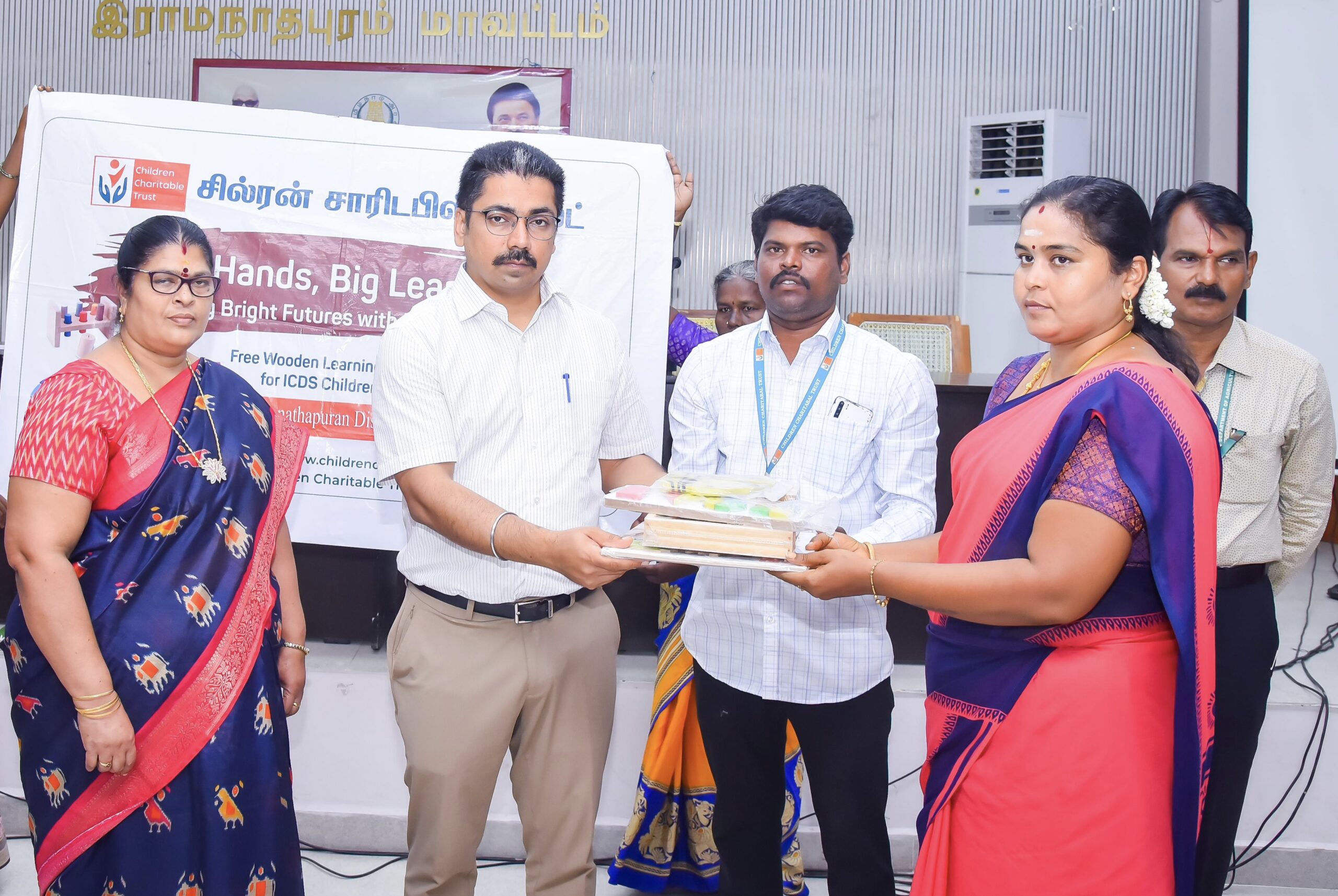 தொடர்ந்து,இராமநாதபுரம் மாவட்ட ஒருங்கிணைந்த குழந்தை வளர்ச்சி பணிகள் திட்டத்தில் உள்ள 1,454 அங்கன்வாடி மையத்தில் 20 குழந்தைகளுக்கு மேல் பயனடைகின்ற 40 அங்கன்வாடி மையங்களை தேர்வு செய்து சில்ரன் சாரிடபில் டிரஸ்ட் மூலம் 5 வகையான கற்றல் பொருள்கள் மற்றும் 1,000 வரைதல் புத்தகங்கள் பெறப்பட்டு அந்தந்த அங்கன்வாடி பணியாளர்களுக்கு மாவட்ட ஆட்சித்தலைவர் வழங்கினார்.