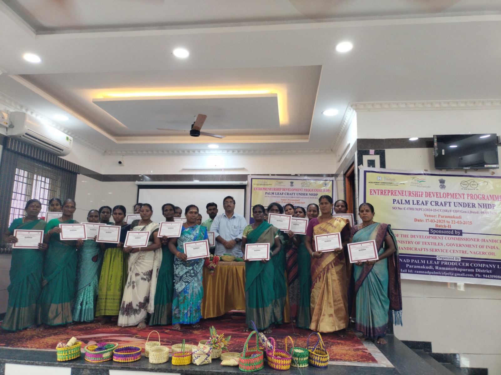இராமநாதபுரம் மாவட்டம் பரமக்குடியில் மத்திய ஜவுளி துறை அமைச்சகம் சார்பில் ராம்நாடு பணை ஓலை உற்பத்தியாளர் நிறுவனம் இணைந்து நடத்தும் தொழில் முனைவோர் மேம்பாட்டு பயிற்சியில் 20 பனை ஓலை கைவினைஞர்களுக்கு ஆறு நாட்கள் நடைபெற்றது. இப்பயிற்சியினை நாகர்கோவில் மத்திய ஜவுளி துறை அமைச்சகம் துணை இயக்குனர் A.K ரூப் சந்தர் அவர்கள் தலைமை தாங்கி பயிற்சியினை தொடங்கி வைத்தார். இப்பயிற்சியில் இராமநாதபுரம் மாவட்ட முன்னோடி வங்கி மேலாளர் கார்த்திகேயன், பரமக்குடி அரசு. ஐ.டி.ஐ முதல்வர் திரு. எஸ்.பி. வாளை ஆனந்தம், பரமக்குடி அரசு கலைக் கல்லூரி ஆங்கிலத்துறைத் தலைவர் திருமதி எம். ரேணுகாதேவி,இராமநாதபுரம் பணை ஓலை உற்பத்தியாளர் நிறுவனத்தின் சேர்மன் கல்யாணி கார்த்திகேயன் ஆகியோர் கிராமப்புற பெண்களுக்கு வாழ்வாதரத்தை மேம்படுத்தும் வகையில் பல நல்ல கருத்துகளை வழங்கினார். இப்பயிற்சியில் பனை ஓலையில் தயாரிக்கப்படும் பொருட்களை பல்வேறு பனை ஓலையில் தயாரிக்கப்படும் பொருட்களை பல்வேறு வண்ணங்களிலும் வடிவத்திலும் மதிப்பு கூட்டி விற்பனை செய்து வருமானத்தை ஈட்டும் வகையில் தொழில் முனைவோர் மேம்பாட்டு பயிற்சி அளிக்கப்பட்டது, இந்த பயிற்சியின் மூலம் 20 பனை ஓலை கைவினைஞர்கள் பயன் பெற்று பாராட்டு சான்றிதழ் பெற்றனர்.