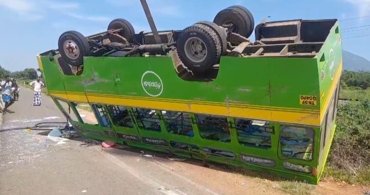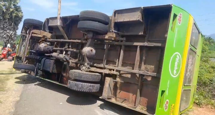 ஒட்டிக் கொண்டு வந்தார். கார்த்திக் (24) நடத்துனராக இருந்தார். அதில் 45 பயணிகள் பயணம் செய்து கொண்டிருந்தனர். அந்த பஸ் பாண்டியராஜபுரம் ரயில்வே கேட் அருகே வந்து கொண்டிருந்தபோது திடீரென்று தன் கட்டுப்பாட்டை இழந்து தலைகீழாக கவிழ்ந்தது.