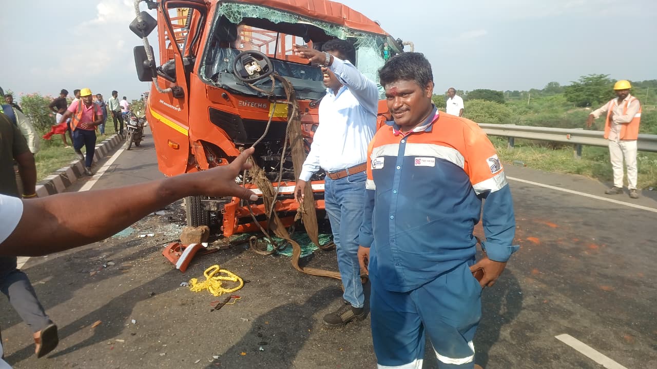 அருகே நின்று கொண்டு இருந்த வாகனம் மீது புத்தம் புதிய லாரி அதிவேகமாக மோதி சுமார் 2 மணி நேரத்துக்கு மேலாக ஓட்டுனர் சிக்கித் தவிப்பு.