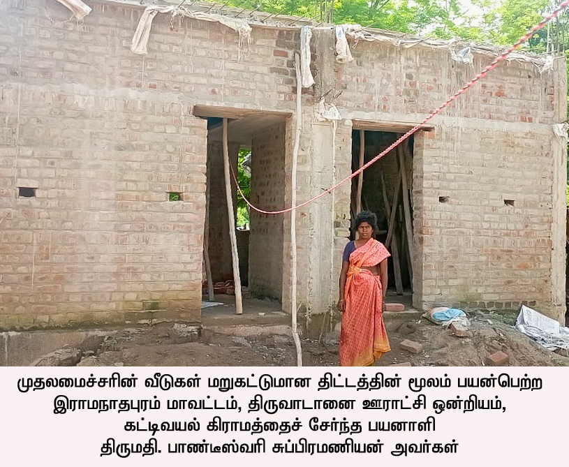 நான் இராமநாதபுரம் மாவட்டம், திருவாடானை ஊராட்சி ஒன்றியம், கட்டிவயல் ஊரட்சியில் வசித்து வருகின்றேன். நான் கூலி வேலை செய்து வருகின்றேன்.எனது கணவர் விவசாய கூலி வேலை செய்து வருகின்றார்.தினமும் எங்களுக்கு கிடைக்கும் கூலி வருமானத்தில் தான் வாழ்ந்து வருகின்றோம். எங்களுக்கென்றிருந்த சொந்தமான வீடு முற்றிலும் சேதமடைந்து பழுது நீக்கம் செய்ய முடியாத நிலையில் இருந்தது.தற்போது முதலமைச்சரின் வீடுகள் மறுகட்டுமான திட்டங்கள் குறித்து கேள்விப்பட்டு வீடு வேண்டி விண்ணப்பித்து இருந்தோம்.