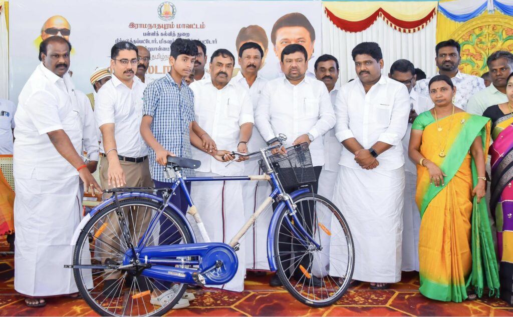 நடப்பாண்டிற்கு மாண்புமிகு தமிழ்நாடு துணை முதலமைச்சர் அவர்கள் இத்திட்டத்தை இன்று துவக்கி வைத்துள்ளார்.அதன் அடிப்படையில் இராமநாதபுரம் மாவட்டத்தில் இன்று 10 பள்ளிகளைச் சேர்ந்த 875 மாணவர்களுக்கும்,868 மாணவிகளுக்கும் என 1743 மாணவ,மாணவிகளுக்கு விலையில்லா மிதிவண்டிகள் வழங்கி துவக்கி வைக்கப்பட்டுள்ளது.இதனைத் தொடர்ந்து அரசு மற்றும் அரசு உதவி பெறும் பள்ளிகளை சேர்ந்த மாணவ, மாணவிகளுக்கு விலையில்லா மிதிவண்டிகள் அந்தந்த பள்ளியில் வழங்கப்படும்.இதன் மூலம் மாவட்டத்தில் 10912 மாணவ,மாணவிகள் விலையில்லா மிதிவண்டி பெற்று பயன்பெற உள்ளனர்.இதன் மூலம் மாணவ,மாணவிகள் கல்வி கற்பதற்கு பயனுள்ள வகையில் இந்த மிதிவண்டிகள் இருந்து வருகிறது.இது போல் மாணவ,மாணவிகள் பயன்பெறும் வகையில் புதுமைப்பெண் திட்டம்,நான் முதல்வன் திட்டம்,தவப்புதல்வன் திட்டம்,காலை உணவு திட்டம் என எண்ணற்ற திட்டங்கள் செயல்படுத்தப்பட்டு இந்தியாவில் மற்ற மாநிலங்கள் பின்பற்றும் வகையிலான திட்டமாக போற்றப்படுகிறது.இத்தகைய பெருமைகளுக்கும் காரணம் மாண்புமிகு தமிழ்நாடு முதலமைச்சர் அவர்களின் திட்டங்களை ஆகும்.இத்தகைய அரசு திட்டங்களை மாணவ செல்வங்கள் சிறந்த முறையில் பயன்படுத்தி உயர்கல்வி வரை படித்து சிறந்த பணிகளுக்கு சென்று பயன்பெற்றிட வேண்டும்.