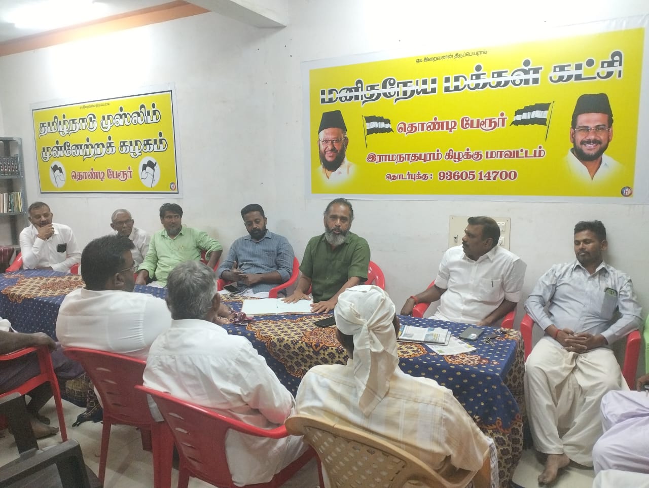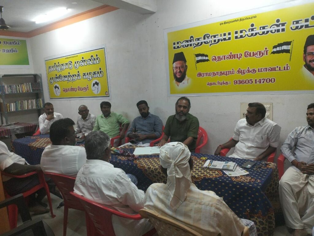 த.மு.மு.க மாநில செயலாளர் தொண்டி சாதிக்,த.மு.மு.க சேவைகள் பற்றியும் வருகின்ற டிசம்பர் 6 த.மு.மு.க சார்பில் பயங்கரவாத எதிர்ப்பு நாளில் மாவட்ட தலைநகரங்களில் நடக்கும் கருப்பு துண்டு அணிந்து நடக்கும் மக்களின் வாழ்வுரிமை,வழிபாட்டு உரிமைகள் உள்ளிட்ட உரிமைகளை பாதுகாத்திட நடைபெறும் கோரிக்கை போராட்டத்தில் தொண்டி சுற்றுவட்டார பகுதியில் இருந்து அதிகமான மக்களை அழைத்து செல்ல வேண்டும் என உரை நிகழ்த்தினார்.இந்த நிகழ்வில் த.மு.மு.க மற்றும் மனிதநேய மக்கள் கட்சியின் பல்வேறு நிர்வாகிகள் மீனவர் அனி மாவட்ட துணைச் செயலாளர் பெரியசாமி,ம.ம.க பரக்கத் அலி,கல்யாணம், ராஜாராம்,ஜலால் நவ்ஃபிக் இப்ராஹிம்,முஸ்தபா செய்யது அஹமது,ரிஸ்வான்,மாரிமுத்து,முருகானந்தம் மணிமாறன்,மாரி ஆகிய நிர்வாகிகள் கலந்து கொண்டனர்.