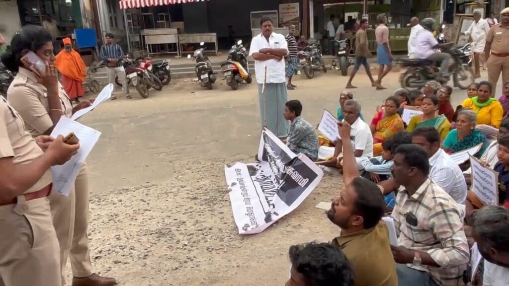 அதை மீட்க வேண்டி 50-க்கும் மேற்பட்ட பெண்கள் உட்பட பொதுமக்கள் கவன ஈர்ப்பு ஆர்ப்பாட்டத்தில் ஈடுபட்டனர். சுமார் ஒரு மணி நேரம் காவல் நிலையம் அருகே சாலை மறியல் ஆர்ப்பாட்டத்தில் ஈடுபட்டனர் நிலையில் காவல்துறையினர் பொதுமக்களிடம் பேச்சுவார்த்தை நடத்தில் வருவாய்த்துறை மற்றும் அறநிலைத்துறையிடம் பேசி உடனடியாக சரி செய்து நடவடிக்கை எடுக்கப்படும் உத்தரவாதம் அளித்த நிலையில் போராட்டத்தை கைவிட்டனர்.