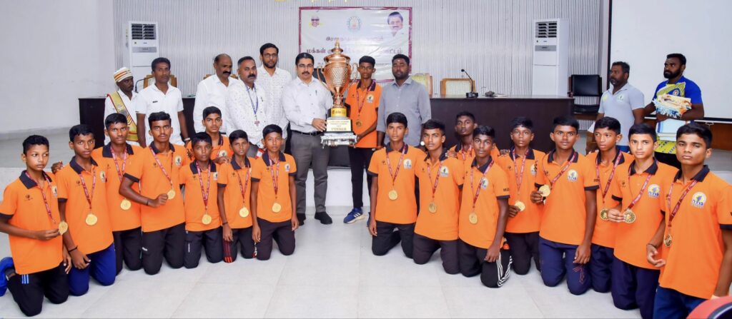 தொடர்ந்து தமிழ்நாடு விளையாட்டு மேம்பாட்டு ஆணையம் மூலம் மாநில அளவில் நடைபெற்ற தமிழ்நாடு பள்ளி ஹாக்கி லீக்-2025 போட்டியில் இராமநாதபுரம் மாவட்ட விளையாட்டு விடுதியில் தங்கி படித்து வரும் செய்யது அம்மாள் மேல்நிலைப்பள்ளி மாணவர்கள் பங்கேற்று வெற்றி பெற்றவர்களுக்கான வெற்றிக் கோப்பையினை மாவட்ட ஆட்சித்தலைவர் சிம்ரன்ஜீத் சிங் காலோனிடம் காண்பித்து வாழ்த்து பெற்றனர்.