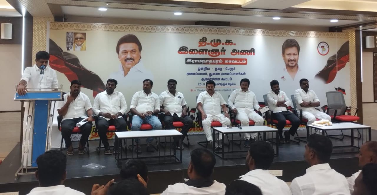 இராமநாதபுரம் மாவட்ட தி.மு.க இளைஞரணி சார்பில் ஆலோசனைக் கூட்டம் பாரதிநகர் பீமாஸ் வைஸ்ராய் கூட்ட அரங்கில் மாவட்ட செயலாளர் காதர்பாட்சா முத்துராமலிங்கம் எம்.எல்.ஏ தலைமையில் நடைபெற்றது.மாநில இளைஞரணி துணைச்செயலாளர் இன்பா A.N.ரகு முன்னிலை வகித்தார்.மாவட்ட இளைஞரணி அமைப்பாளர் மண்டபம் சம்பத் ராஜா வரவேற்றார்.தி.மு.க இளைஞரணி செயலாளர்,தமிழ்நாடு துணை முதலமைச்சர் உதயநிதி ஸ்டாலினின் 48-வது பிறந்த நாளை (நவ.27) முன்னிட்டு பல்வேறு நலத்திட்ட உதவிகளை வழங்க வேண்டும்,2026 சட்டமன்ற தேர்தல் வெற்றிக்கு உழைக்க வேண்டும் என மாவட்ட செயலாளர் காதர் பாட்சா முத்துராமலிங்கம் எம்.எல்.ஏ பேசினார்.மாவட்ட இளைஞரணி துணை அமைப்பாளர் கவுன்சிலர் ரமேஷ் கண்ணா உட்பட மாவட்ட,நகர,ஒன்றிய இளைஞரணி துணை அமைப்பாளர்கள்,நிர்வாகிகள் பலர் பங்கேற்றனர்.