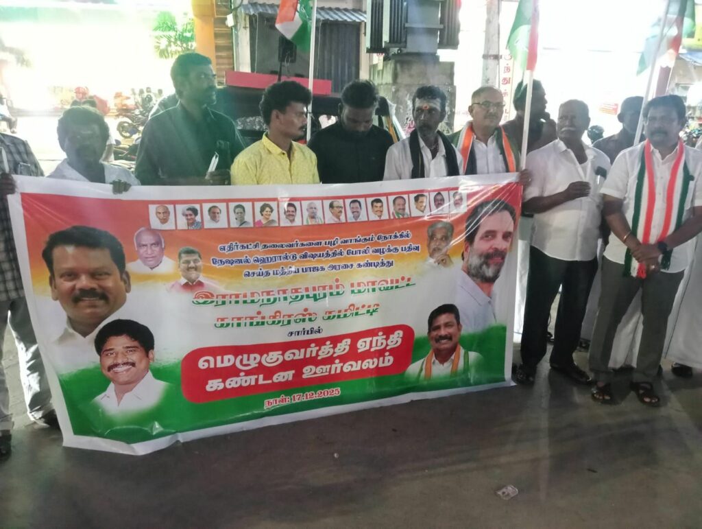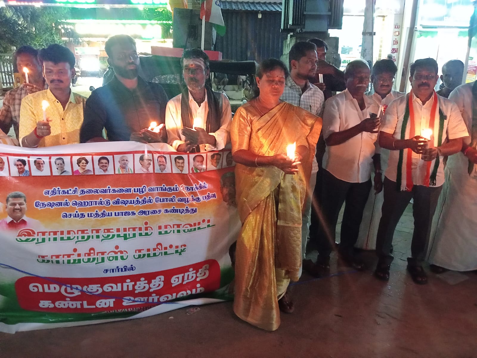 எதிர்க்கட்சி தலைவர்களை பழி வாங்கும் நோக்கில் நேஷனல் ஹெரால்டு விஷயத்தில் பொய் வழக்கு பதிவு செய்த ஒன்றிய அரசை கண்டித்து இராமநாதபுரம் மாவட்ட காங்கிரஸ் கமிட்டி சார்பில் அரண்மனை முன்பு மெழுகுவர்த்தி ஏந்தி கண்டன ஊர்வலம் நடந்தது.