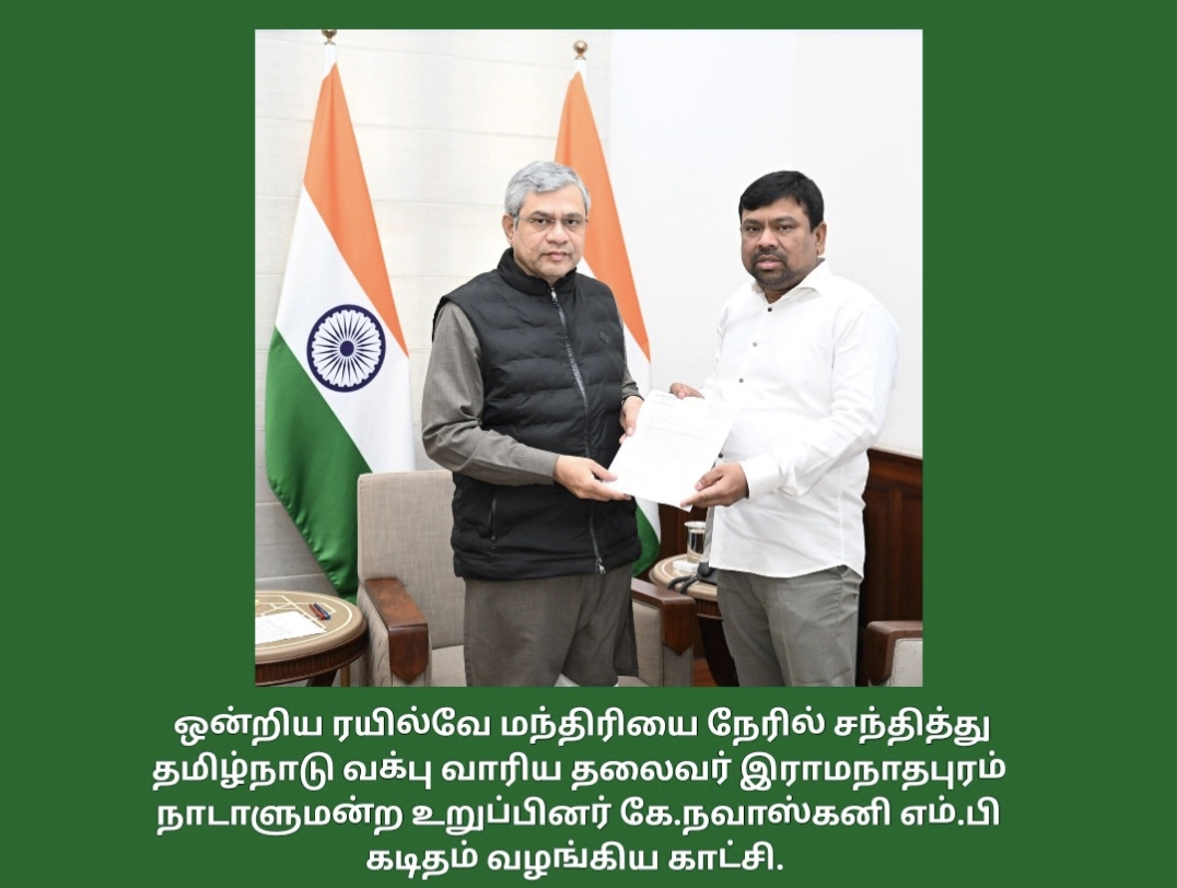 ஒன்றிய ரயில்வே மந்திரி அஸ்வினி வைஷ்ணவை நேரில் சந்தித்து தமிழ்நாடு வக்பு வாரிய தலைவர்,இராமநாதபுரம் நாடாளுமன்ற உறுப்பினர் கே.நவாஸ்கனி எம்.பி வழங்கிய கடிதத்தில் கூறியிருப்பதாவது:-
