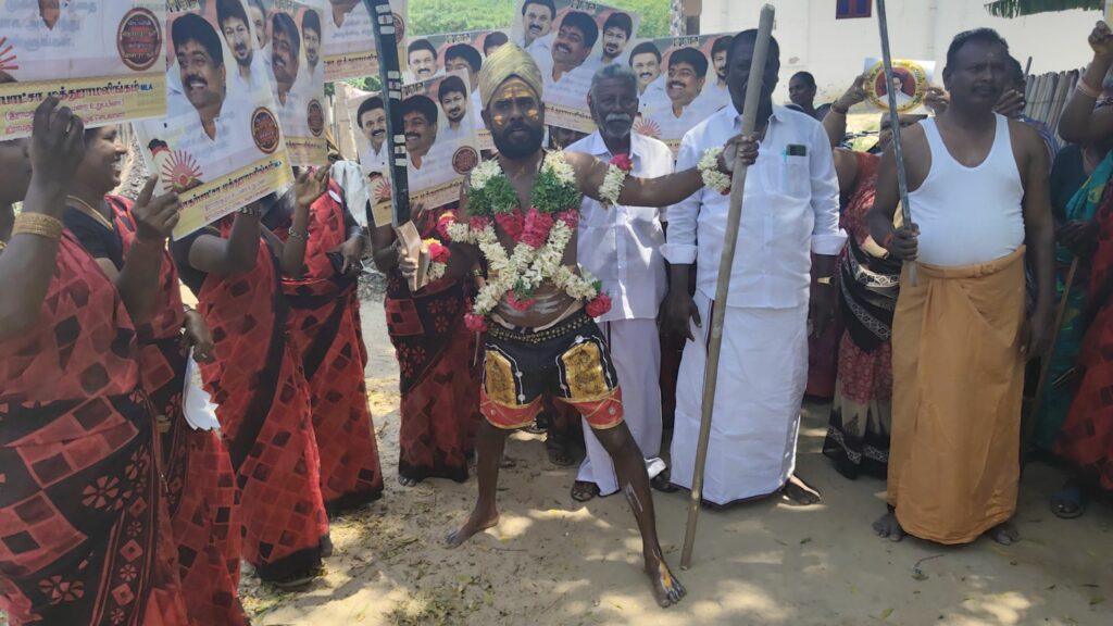 ராமநாதபுரம் அருகே தாதனேந்தல் ஊராட்சியில் “வெல்லும் தமிழ்ப்பெண்கள்” பிரச்சார நிகழ்ச்சியில் தி.மு.க நிர்வாகி பள்ளபச்சேரி ராஜேந்திரன் நவீன கருப்புசாமி வேடமணிந்து நூதன முறையில் திராவிட மாடல் அரசின் அனைத்து தரப்பு மக்களுக்கான நலத்திட்டங்களை விளக்கி பிரச்சாரம் மேற்கொண்டது ராமநாதபுரம் மாவட்ட மக்களின் கவனத்தை ஈர்த்துள்ளது.