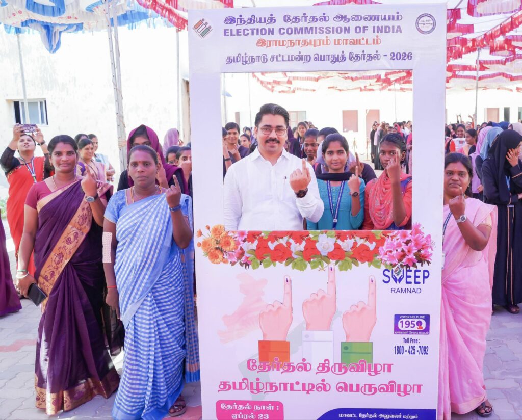 தமிழ்நாடு சட்டமன்ற பொதுத் தேர்தல் 2026-யை முன்னிட்டு,ராமநாதபுரம் முஹம்மது சதக் ஹமீது மகளிர் கலை மற்றும் அறிவியல் கல்லூரியில் தமிழ்நாடு ஊரக வாழ்வாதார இயக்க திட்டத்துறை மற்றும் செய்தி மக்கள் தொடர்பு துறை மூலம் வாக்காளர் விழிப்புணர்வு நிகழ்ச்சி நடைபெற்றது. இந்நிகழ்ச்சியில் மாவட்ட தேர்தல் அலுவலர் / மாவட்ட கலெக்டர் சிம்ரன்ஜீத் சிங் காலோன் பங்கேற்று கல்லூரியில் மாணவிகள் முன்னிலையில் வாக்காளர் விழிப்புணர்வு குறித்த உறுதிமொழி மேற்கொண்டதுடன்,மாணவிகளிடம் ஒவ்வொருவரும் வாக்குபதிவு நாளான (23.04.2026) அன்று தவறாமல் வாக்களித்து மாவட்டத்தில் அனைவரும் வாக்களிக்கப்பட்டது என்ற நிலையை உருவாக்கிட வேண்டும் என தெரிவித்தார்.