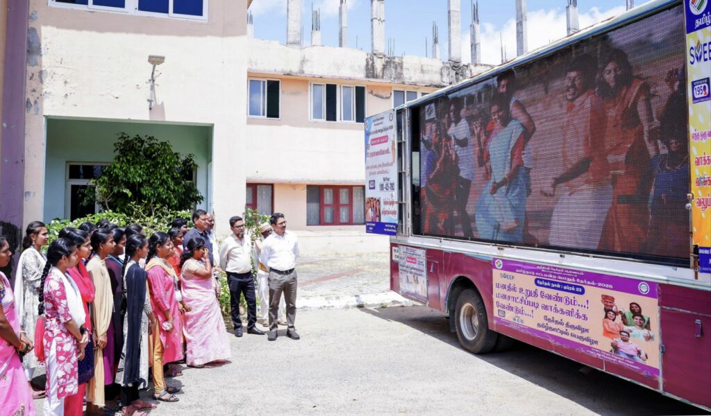 பின்னர் செய்தி மக்கள் தொடர்பு துறையின் மூலம் வாக்காளர் விழிப்புணர்வு குறித்த குறும்படம் அதிநவீன மின்னணு திரை வாகனத்தில் திரையிடப்பட்டு சுமார் 500-க்கும் மேற்பட்ட மாணவிகள் பங்கேற்று பார்வையிட்டு சென்றனர்.