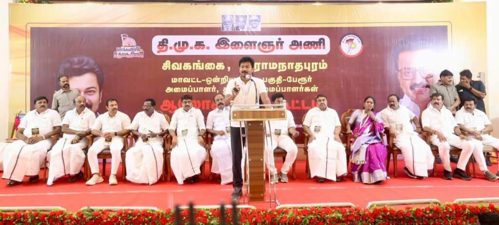 இன்று சிவகங்கை மற்றும் ராமநாதபுரம் மாவட்ட இளைஞர் அணி அமைப்பாளர்கள், நிர்வாகிகள் உங்கள் அனைவரையும் ஒரே இடத்தில் சந்திப்பதில் மிகுந்த மகிழ்ச்சி அடைகிறேன். நேற்று காலையில் கோவையில் தொடங்கி கோவை, நீலகிரி, திருப்பூர், ஈரோடு, கரூர், திண்டுக்கல், தேனி, மதுரை, விருதுநகர் அமைப்பாளர்களையும் உங்களையெல்லாம் என அனைத்து மாவட்ட சந்தித்து சந்திப்பதற்காக இன்றைக்கு சிவகங்கை மாவட்டத்துக்கு வருகை தந்திருக்கிறேன்.